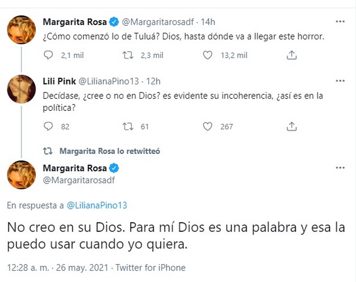 Luego de varios usuarios de las redes sociales hablan sobre lo que piensa Margarita Rosa, ella se defendió diciendo: “No creo en su Dios. Para mí Dios es una palabra y esa la puedo usar cuando yo quiera”.