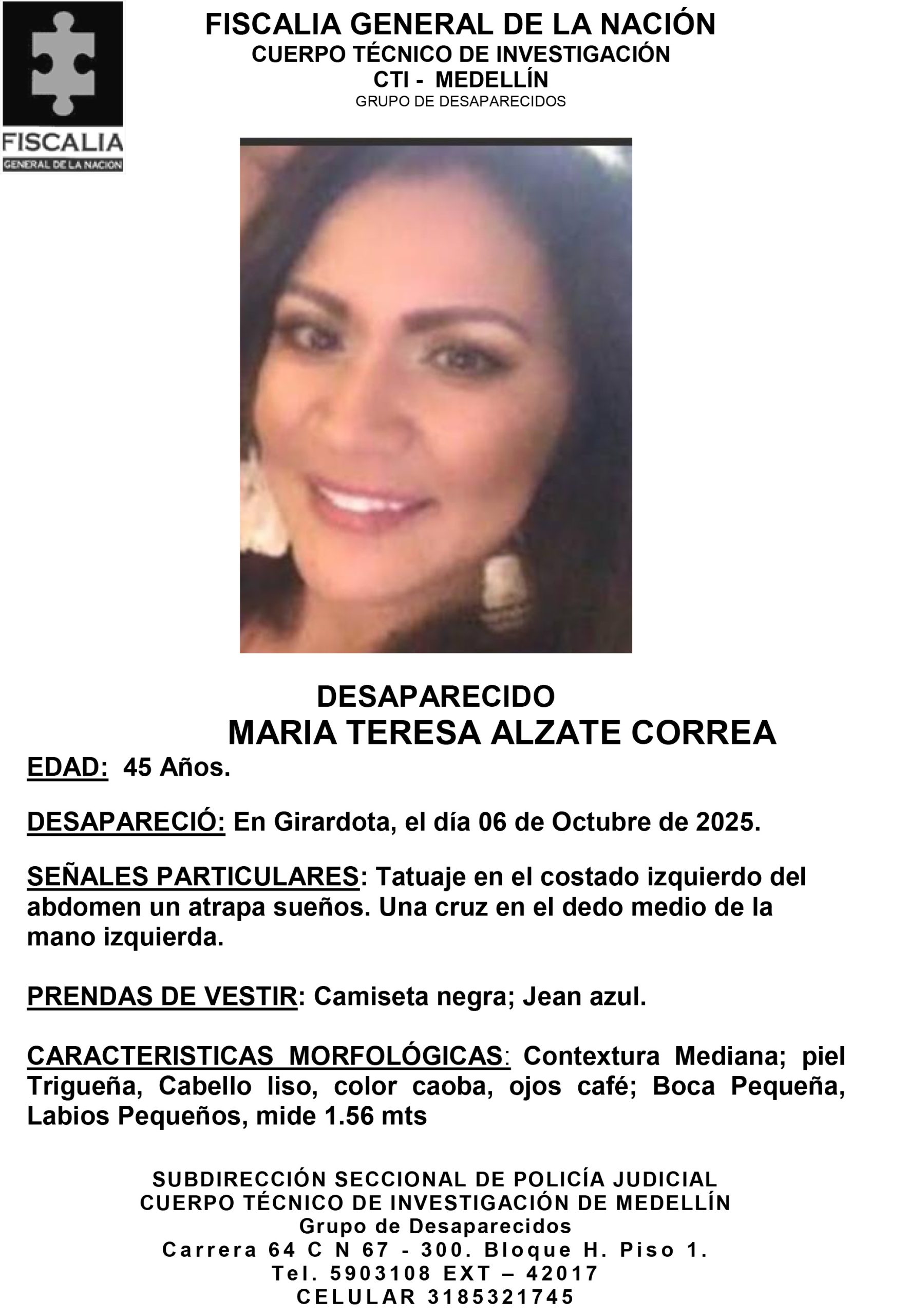 Resumen: María Teresa Alzate Correa, de 45 años, fue reportada como desaparecida el pasado 6 de octubre de 2025 en el municipio de Girardota, Antioquia.