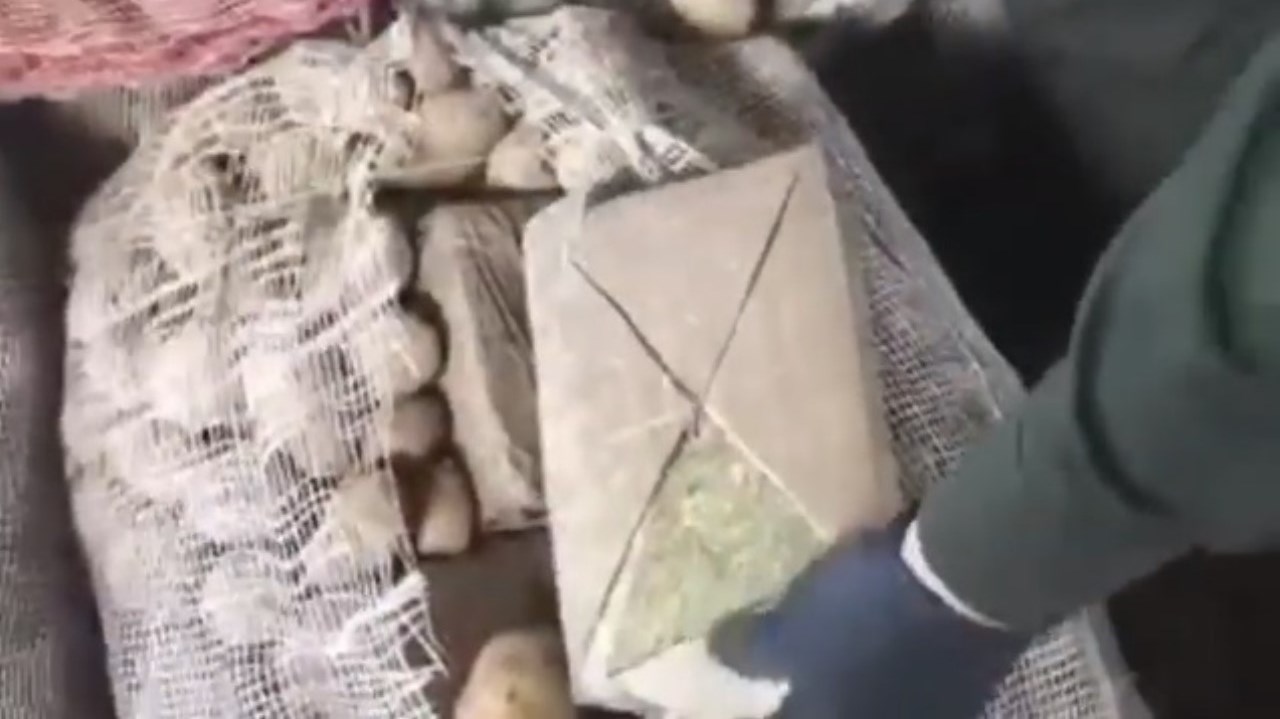 El video grabado por uniformados se observa el momento en que un policía abrió el costal de papa que en su interior traía la marihuana oculta.