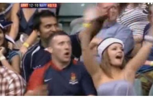rugby1En esta ocasión una bella marinera fue víctima de las cámaras que la tomaron y al ofrecer un “calurosos” saludo su acompañante le quitó la blusa, por lo que quedó ponchada en la pantalla gigante del estadio.