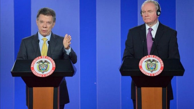 Tras reunirse con el presidente colombiano, Juan Manuel Santos, McGuinness, quien fue militante del Ejército Republicano Irlandés (IRA) y ahora es dirigente del Sinn Fein, mostró el apoyo de su Gobierno al proceso de paz con las Fuerzas Armadas Revolucionarias de Colombia (FARC).
