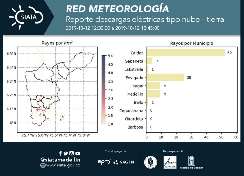 Caldas con 52 y Envigado con 25, son los municipios que mayor cantidad de descargas eléctricas han presentado entre las 12:30 del día y la 1:45 de la tarde. Le siguen Itagüí y el sur de Medellín, cada uno con 9 rayos. Sabaneta con 4. Y en La Estrella y Bello, uno respectivamente.