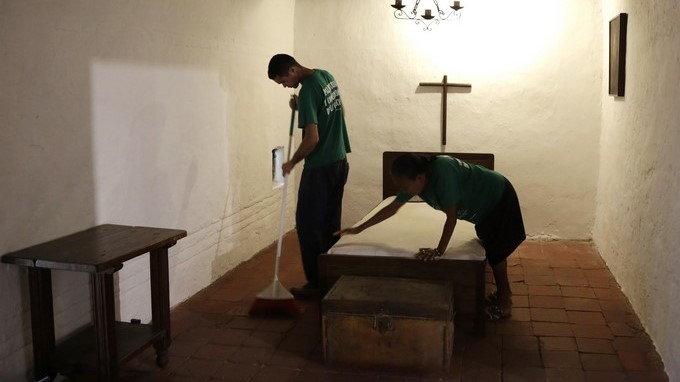 Fotografía que muestra a a dos trabajadores mientras limpian la habitación que habitaba el sacerdote Pedro Claver durante su misión en Cartagena en el siglo XVII, en el Santuario de San Pedro Claver de Cartagena (Colombia). EFE