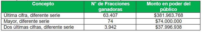 Fueron tres los ganadores de secos, uno de ellos ubicado en Sincelejo con una fracción de un seco de $10 millones con el número 3307 serie 078; otro con un billete ganador de un seco de $10 millones con el número 9648 serie 066 en Itagüí, y otro más con el billete 6422 serie 287, que resultó favorecido con otro seco de $10 millones en la ciudad de Medellín.