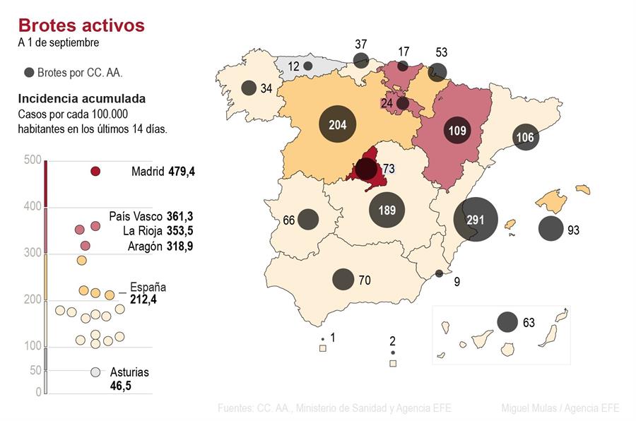 En Galicia, donde sigue la inquietud por el brote de coronavirus originado en una residencia de O Incio (Lugo) que afecta a 89 residentes y 27 trabajadores, el presidente de la Xunta, Alberto Núñez Feijoo, ha anunciado test masivos de covid a través de muestras de saliva, que comenzarán en septiembre y se prevé la realización unos 100.000 al mes.