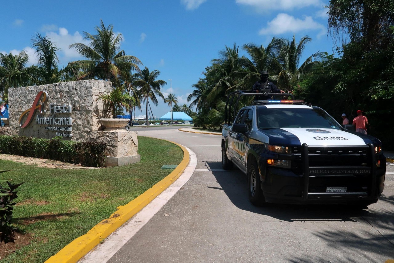 Fotografía de un vehículo policial en la zona donde se presentó un tiroteo que dejó tres personas muertas, hoy, en la playa de un hotel del balneario de Cancún, Quintana Roo (México). EFE/ Alonso Cupul