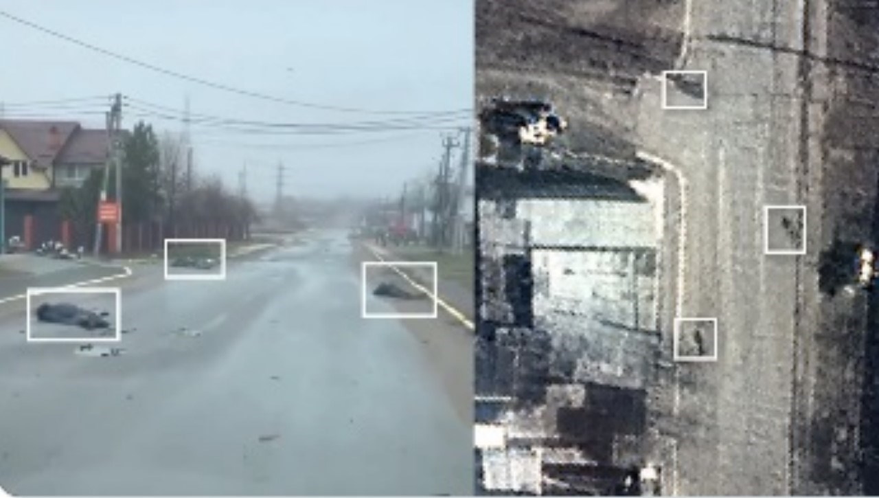 Medios locales han afirmado que las fotografías captadas en marzo, cuando las tropas rusas todavía estaban en la ciudad, muestran al menos once bultos por lo que presumen que sea un cadáver en una de las calles de la ciudad.
