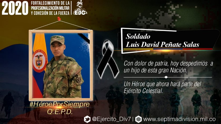 “Mientras realizaban estas labores fueron atacados con armas de fuego y lamentablemente fue asesinado nuestro soldado Luis David Peñate Salas, de 19 años de edad, oriundo de Colosó, Sucre, quien protegía a las comunidades que habitan en esta región. Esta es una clara violación a los Derechos Humanos e infracción al Derecho Internacional Humanitario”, detalló el Ejército.