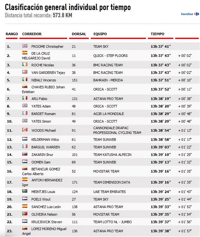 En la general no hubo cambios y Froome mantuvo “la roja” con 2 segundos de ventaja sobre el español David de la Cruz (Quick Step) y el irlandés Nicolas Roche (BMC), segundo y tercero respectivamente.
