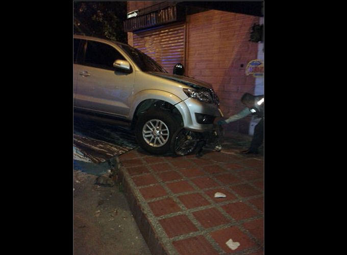 El conductor de la Toyota reaccionó ante el hecho y emprendió la persecusión contra sus asaltantes; dos cuadras después de donde fue atracado los alcanzó y los arrolló; colisionando contra un restaurante, luego de pasar por encima de los atracadores.