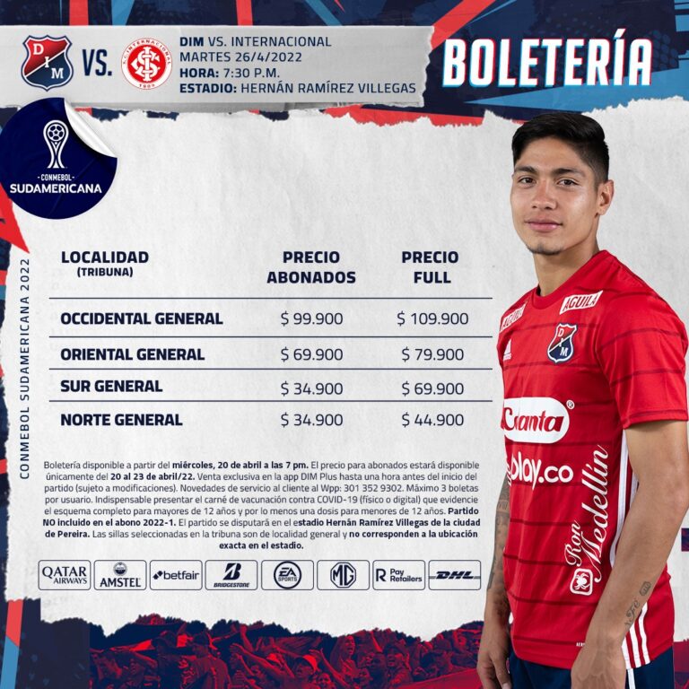El Deportivo Independiente Medellín puso en venta la boletería para el choque de Copa Sudamericana ante Internacional de Porto Alegre, que por cuestiones logísticas y de ocupación del Atanasio Girardot para conciertos, se jugará finalmente en la ciudad de Pereira.