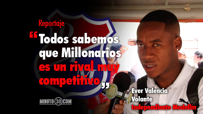 Minuto30.com- En Independiente Medellín todo es “felicidad, tranquilidad y unión” por estos días, así lo manifiesta Ever Valencia, quien está empeñado en ganarse la confianza del entrenador Octavio Zambrano, para así consolidarse en la titular del ‘Equipo del Pueblo’ este semestre.