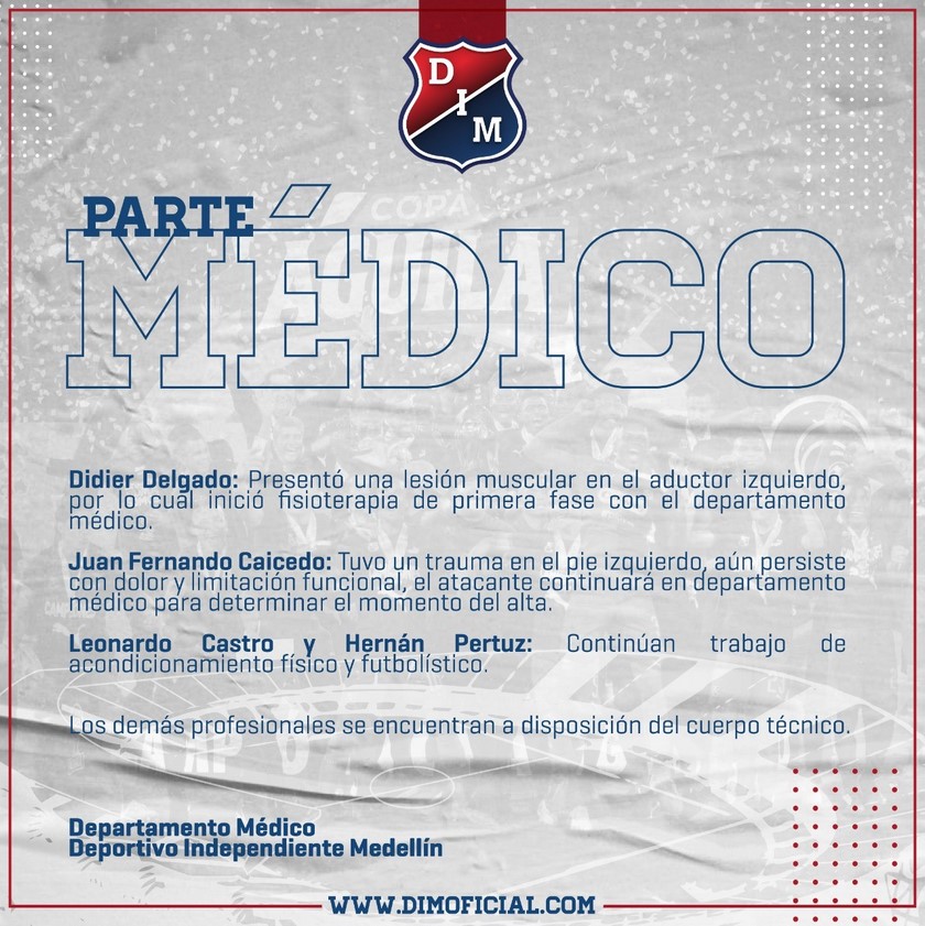 Minuto30.com- Deportivo Independiente Medellín emitió en víspera del partido de la cuarta fecha de la Liga I, frente a Patriotas Boyacá, un reporte de los jugadores que están en departamento médico.