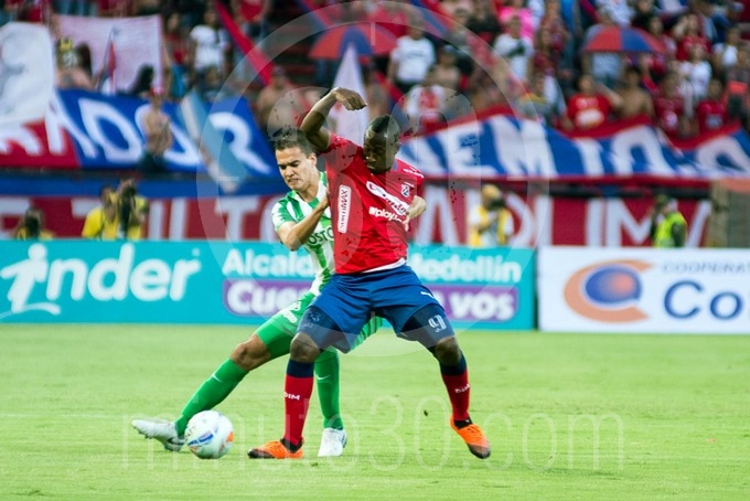 Felipe Aguilar y Juan Fernando Caicedo disputan un balón en el clásico antioqueño.