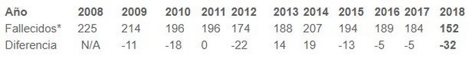 En este 2018 son 152 muertes, que comparadas con los 184 casos del mismo periodo del año pasado, representa una disminución de 32 muertes menos, lo que significa la mayor reducción en los últimos diez años.