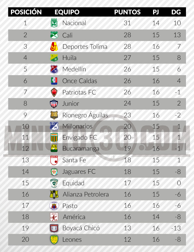 Minuto30.com- La fecha 16 de la Liga Águila I-2018, que se cumplió en el transcurso de la presente semana, trajo consigo varios movimientos en la tabla de posiciones.