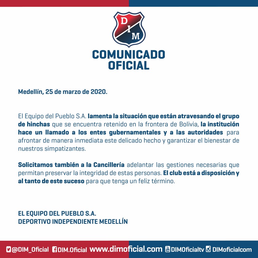 Minuto30.com- Deportivo Independiente Medellín emitió este miércoles un comunicado de prensa en el que se refirió a la situación que atraviesan algunos de sus hinchas, que se quedaron atrapados en Argentina.
