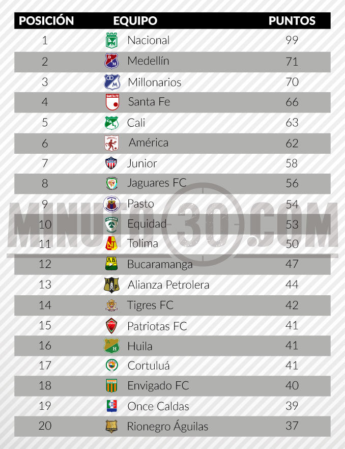 Minuto30.com- Cumplida la decimonovena fecha de la Liga Águila II-2017, Independiente Medellín se mantiene en el segundo lugar de la tabla de reclasificación con 71 puntos.