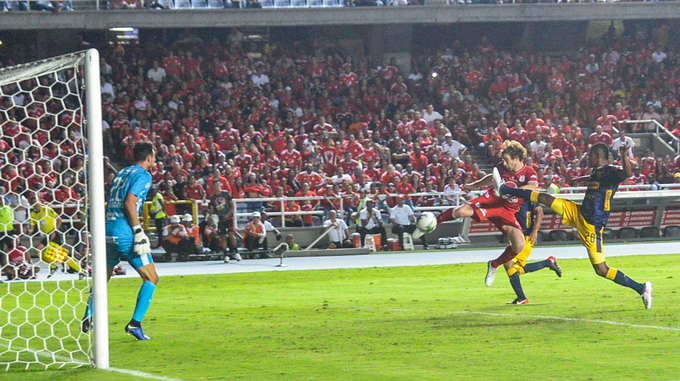 Pero la reacción de los ‘Diablos Rojos’ letal, pues tras la mencionada jugada, salió en busca de la portería contraria y anotó el 2-0, de nuevo por intermedio de Aristeguieta, quien desde afuera de la media luna remató con potencia y por segunda ocasión en la tarde, vulneró el arco de David González.