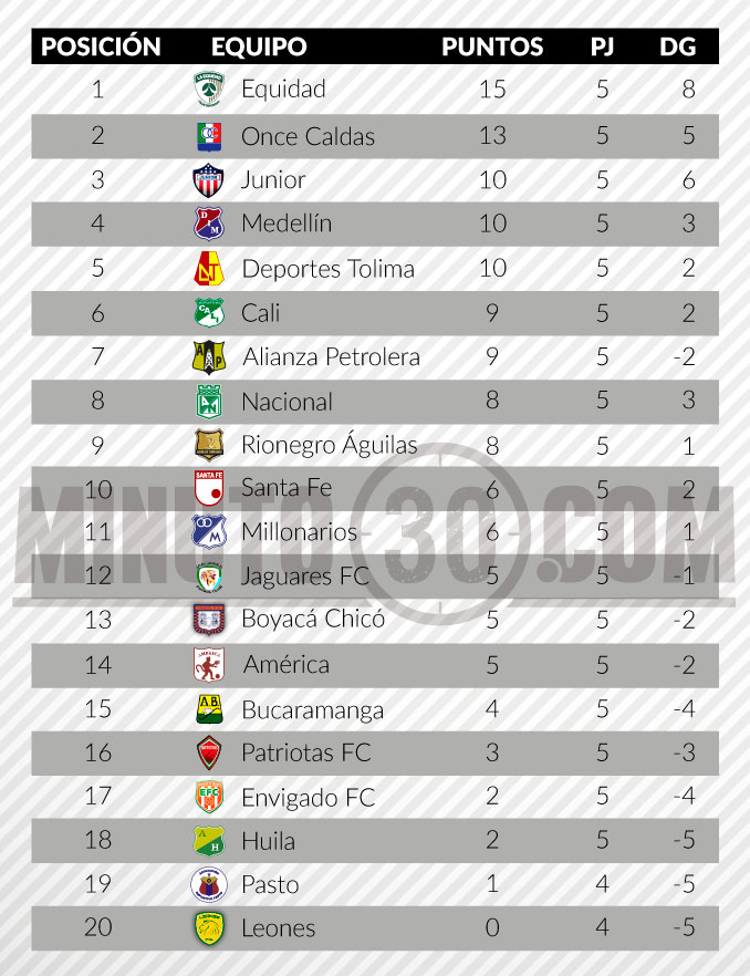 Por su parte, La Equidad se mantiene firme en el primer lugar, con 15 puntos de 15 posibles.