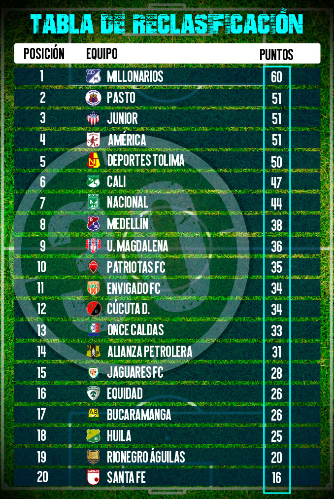 Sin embargo, en reclasificación el panorama es muy diferente, pues Millonarios impone un paso muy firme, que le permite mantenerse en el primer lugar (60 puntos) y con una muy cómoda ventaja sobre sus persecutores.