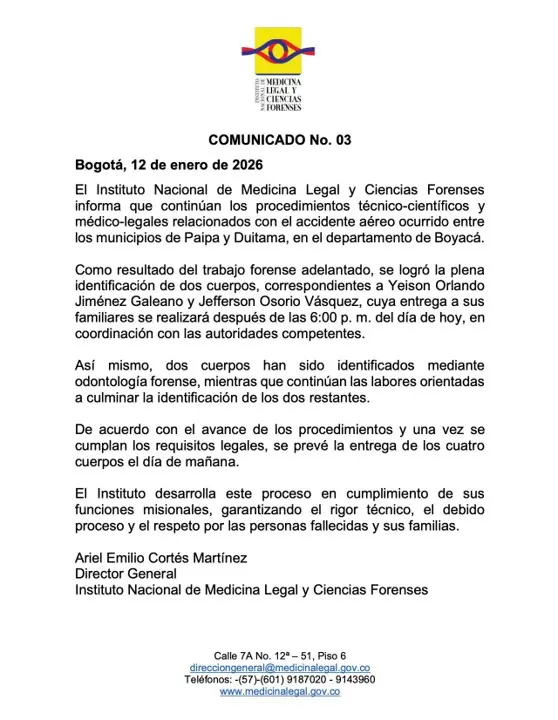 Minuto30.com .- El Instituto Nacional de Medicina Legal y Ciencias Forenses, bajo la dirección de Ariel Emilio Cortés Martínez, emitió un comunicado oficial sobre el avance de las labores técnico-científicas tras la tragedia aérea en Boyacá. Gracias al rigor de los peritos, ya se ha logrado la identificación plena de dos de las seis víctimas.