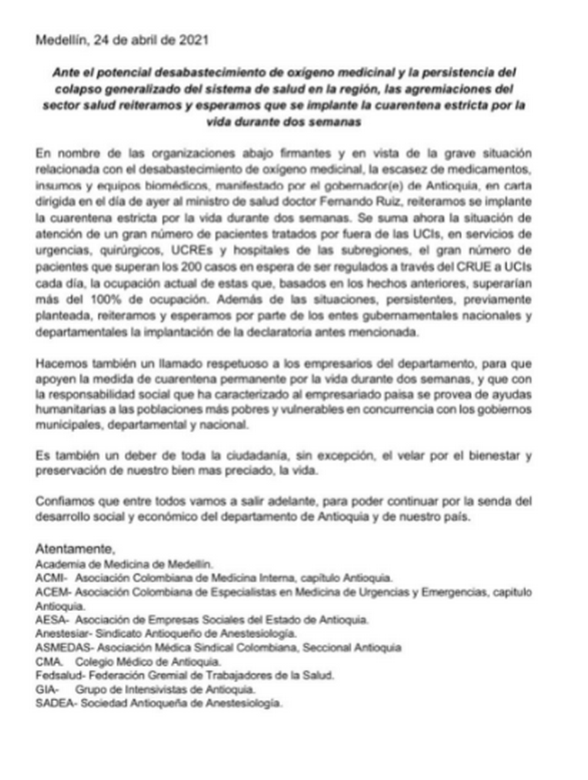 Nuevamente los gremios médicos de Antioquia solicitan cuarentena total y llaman al empresariado para aportar ayudas humanitarias pic.twitter.com/iz4yUwUH3l