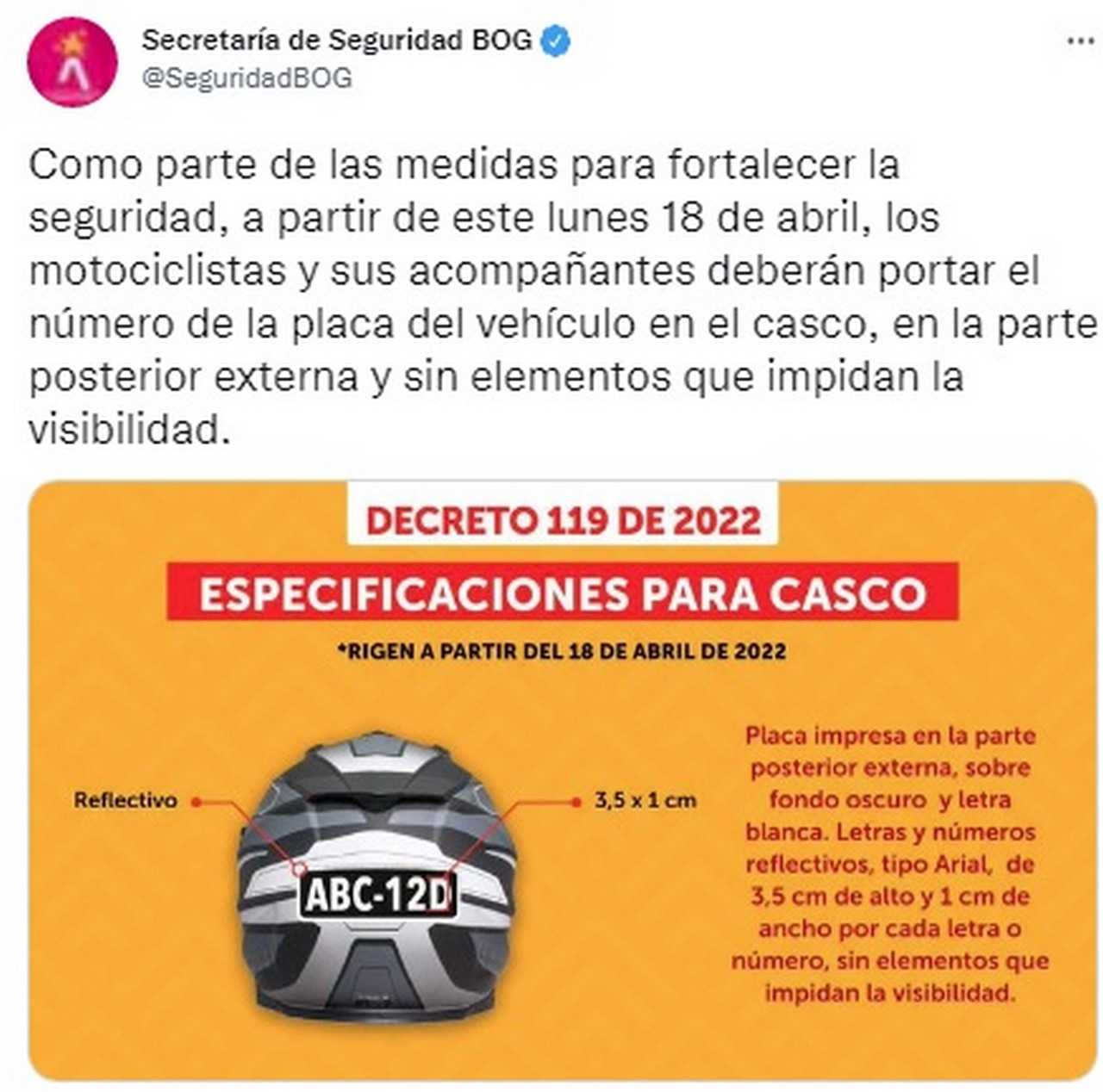 La Secretaría de Seguridad, Convivencia y Justicia recordó que desde este lunes 18 de abril empezarán a regir las medidas para motociclistas y acompañantes en Bogotá.