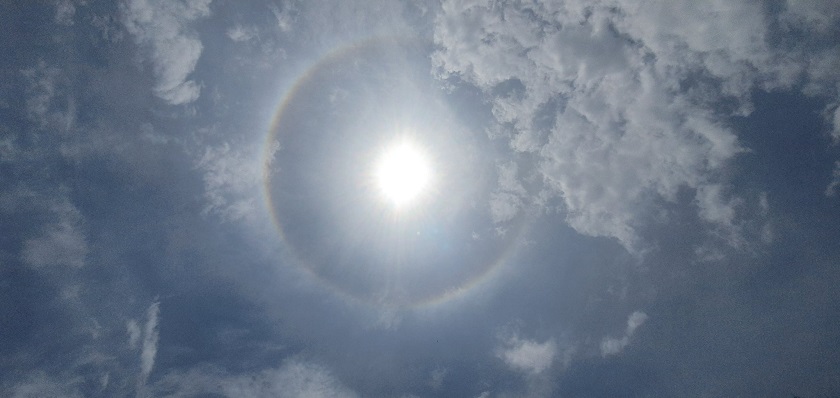 El Halo Solar es producido por la presencia de micro-cristales de hielo en la troposfera, que refractan la luz del sol generalmente con radios angulares de 22°.