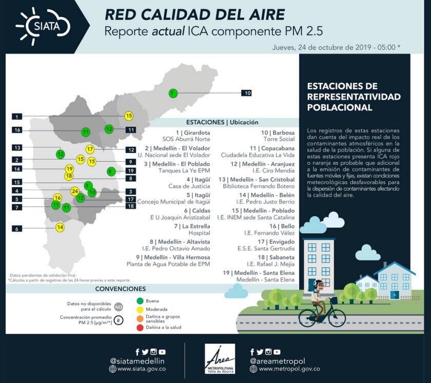 Bello, Copacabana, Barbosa, Santa Elena, Sabaneta y La Estrella son algunas de las que mantienen buena calidad del aire. Estaciones como el Volador, Villa Hermosa, Itagüí y Belén, presentan condiciones meteorológicas desfavorables para la dispersión de contaminantes.
