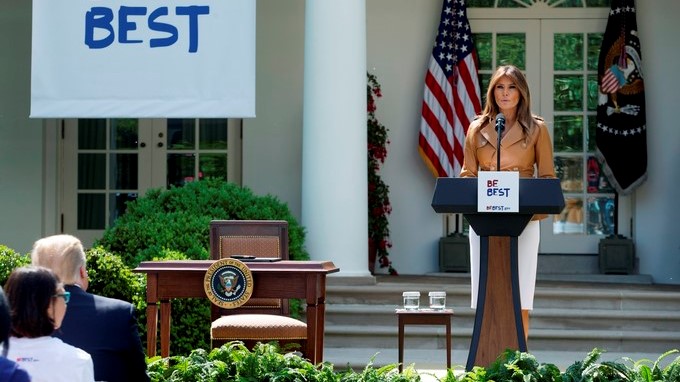 La primera dama de Estados Unidos, Melania Trump, lanzó hoy una campaña centrada en los niños y destinada a luchar contra el abuso de opioides y contra el acoso en Internet, una misión que ha despertado escepticismo debido al comportamiento hostil en Twitter de su marido, Donald Trump.