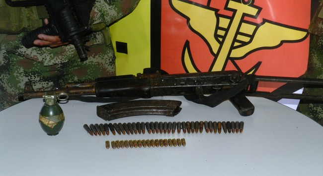 En el momento de su conducción, el menor tenía en  su poder 18 cartuchos calibre 9 mm, y en el registro del área que realizaron las tropas de la Cuarta Brigada y Policía, a 5 metros del sitio de la captura, fue encontrado un fusil AK 47 con cartucho en la recamara; y más adelante las tropas encontraron una granada de fragmentación IM26, un proveedor metálico y 29 cartuchos calibre 7.62 mm.