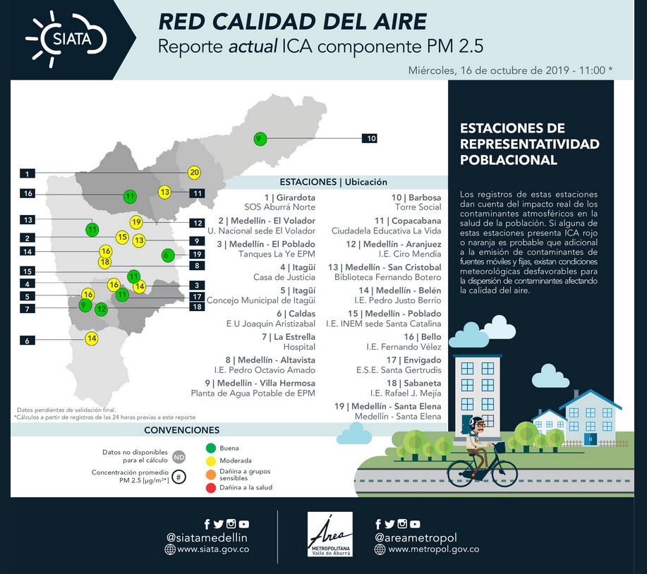 Bello, Santa Elena, San Cristóbal y La Estrella son algunas de las que mantienen buena calidad del aire. Estaciones como el Volador, Villa Hermosa, Itagüí y Caldas, correspondientes al norte, centro y sur del Valle de Aburrá, presentan condiciones meteorológicas desfavorables para la dispersión de contaminantes.