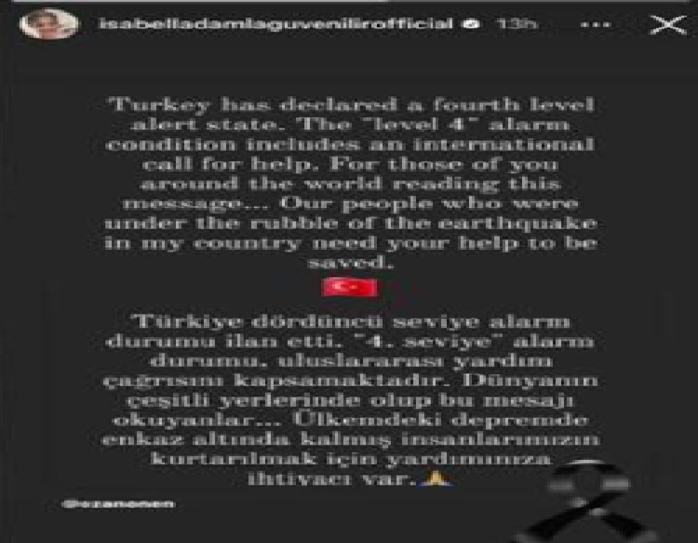 “Turquía declaró un estado de alerta de cuarto nivel. La condición de alarma de ‘nivel 4’ incluye una llamada de ayuda internacional. Para aquellos alrededor del mundo que leen este mensaje […]. Nuestra gente quedó bajo escombros después del terremoto. Mi país te necesita de tu ayuda para salvarse”, Dice la traducción del texto publicado por Isabella Damla Güvenilir,.
