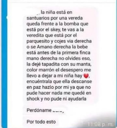 En el mensaje que, al parecer, la supuesta madre de la bebé le envió a otra persona para que fueran a buscarla, se lee: “la dejé tapadita con su manta color marrón, el desespero me llevó a dejar a mi niña ahí. Encuéntrela, que ella descanse en paz, hazlo por mí ya que no pude hacer nada, me quedé en shock y no pude ni ayudarla. Perdóname por todo esto”.