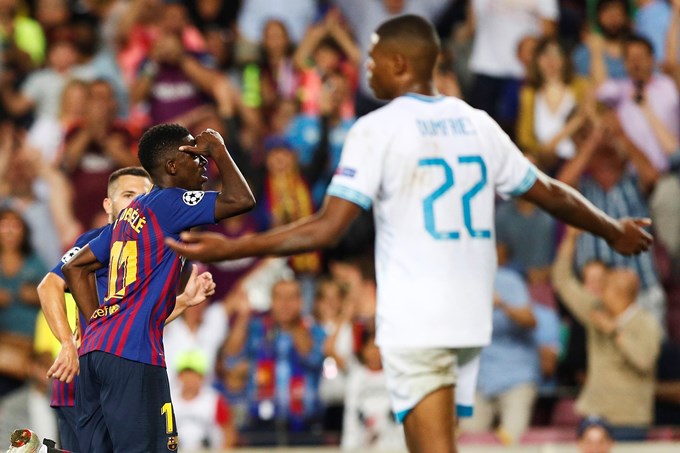 El delantero francés del FC Barcelona Ousmane Dembélé (i), celebra su gol anotado durante el primer partido del grupo B de la Liga de Campeones, disputado contra el PSV Eindhoven en el Estadio Camp Nou, en Barcelona. EFE