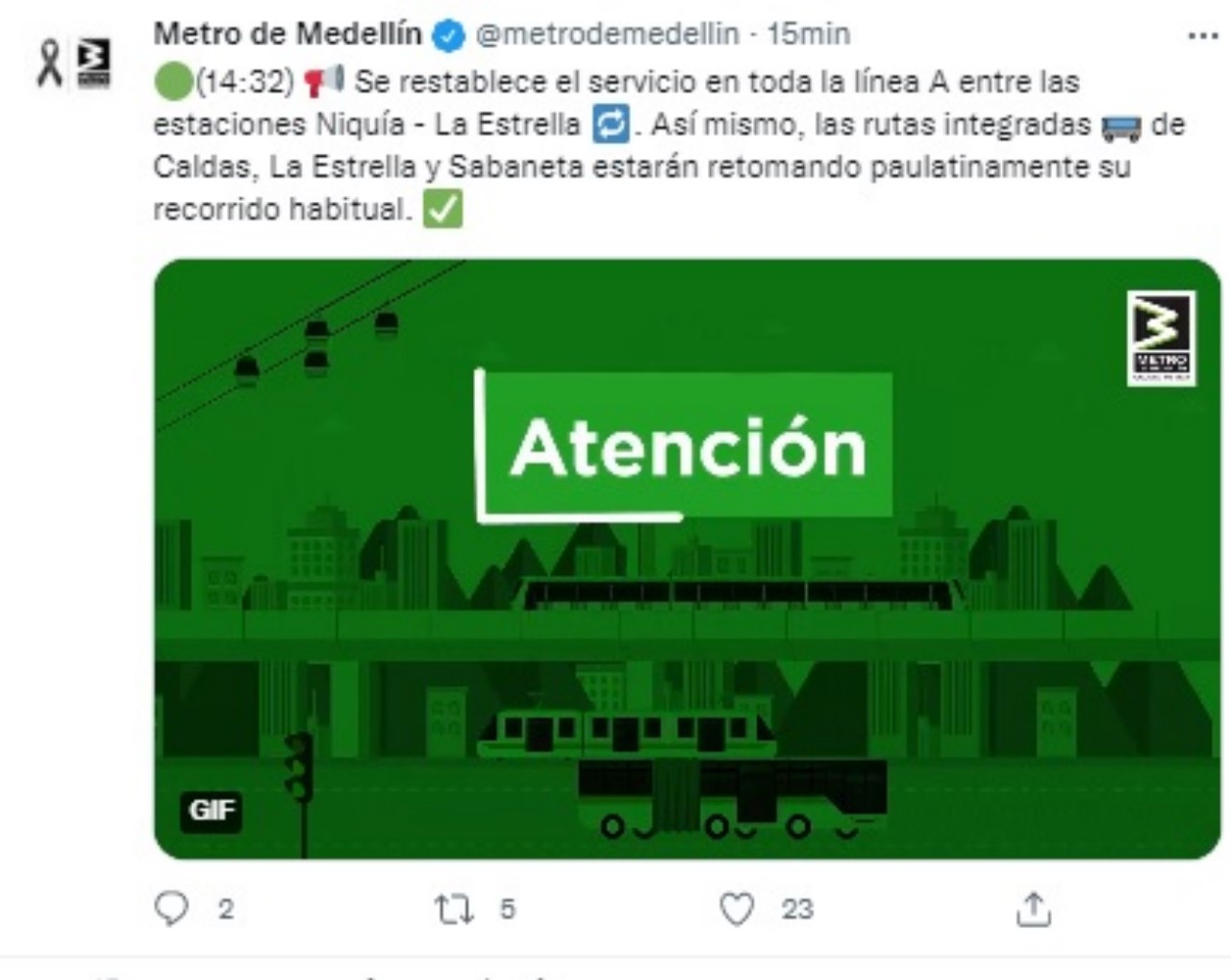 “Se restablece el servicio en toda la línea A entre las estaciones Niquía – La Estrella 🔁. Así mismo, las rutas integradas 🚌 de Caldas, La Estrella y Sabaneta estarán retomando paulatinamente su recorrido habitual”, detalló la entidad en su cuenta de Twitter.