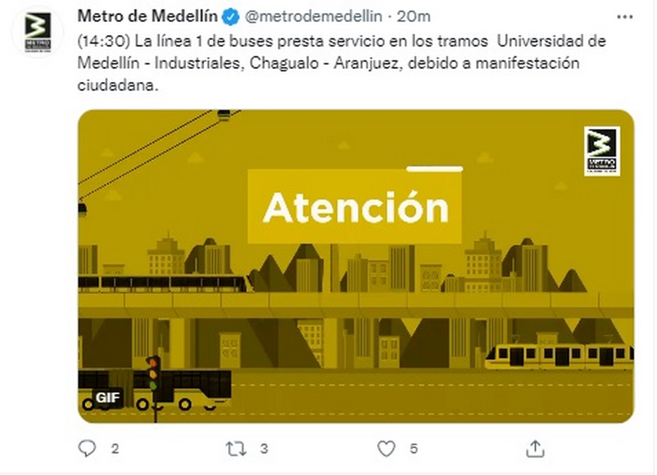 “La línea 1 de buses presta servicio en los tramos Universidad de Medellín – Industriales, Chagualo – Aranjuez, debido a manifestación ciudadana”, informó el Metro.