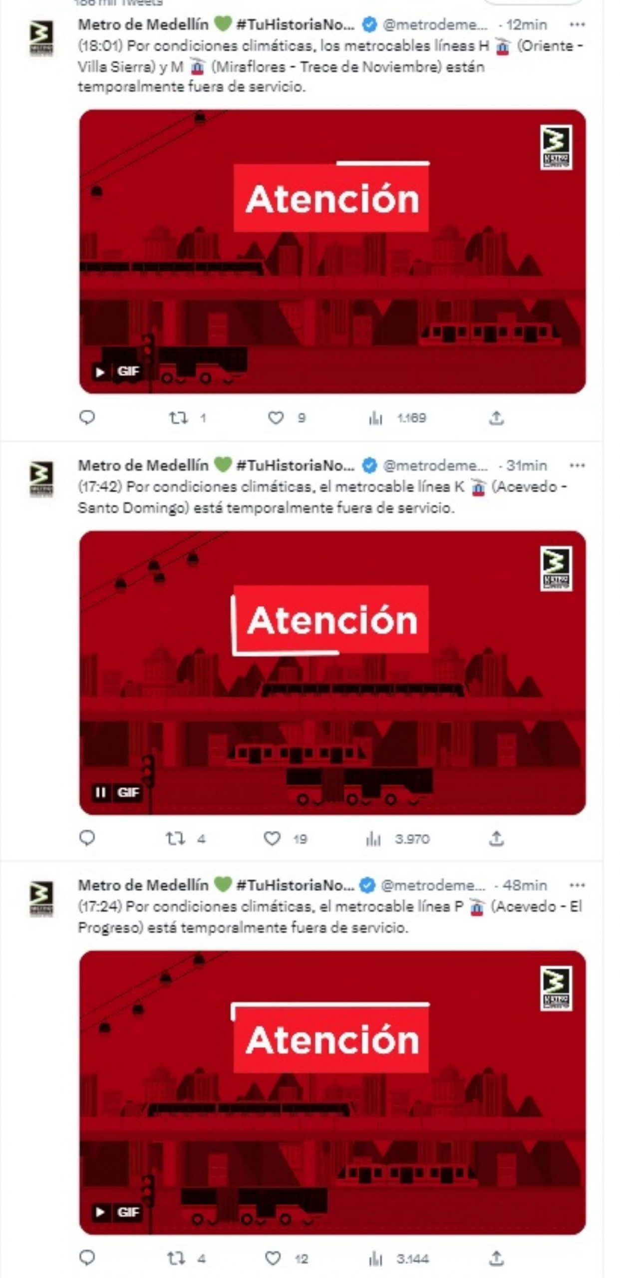 Por medio de la cuenta de Twitter, la Empresa de Transporte Masivo del Valle de Aburrá – Metro de Medellín – informó que “por condiciones climáticas, todos los metrocables de la red Metro (líneas J, P, K, L, H y M) están temporalmente fuera de servicio”.