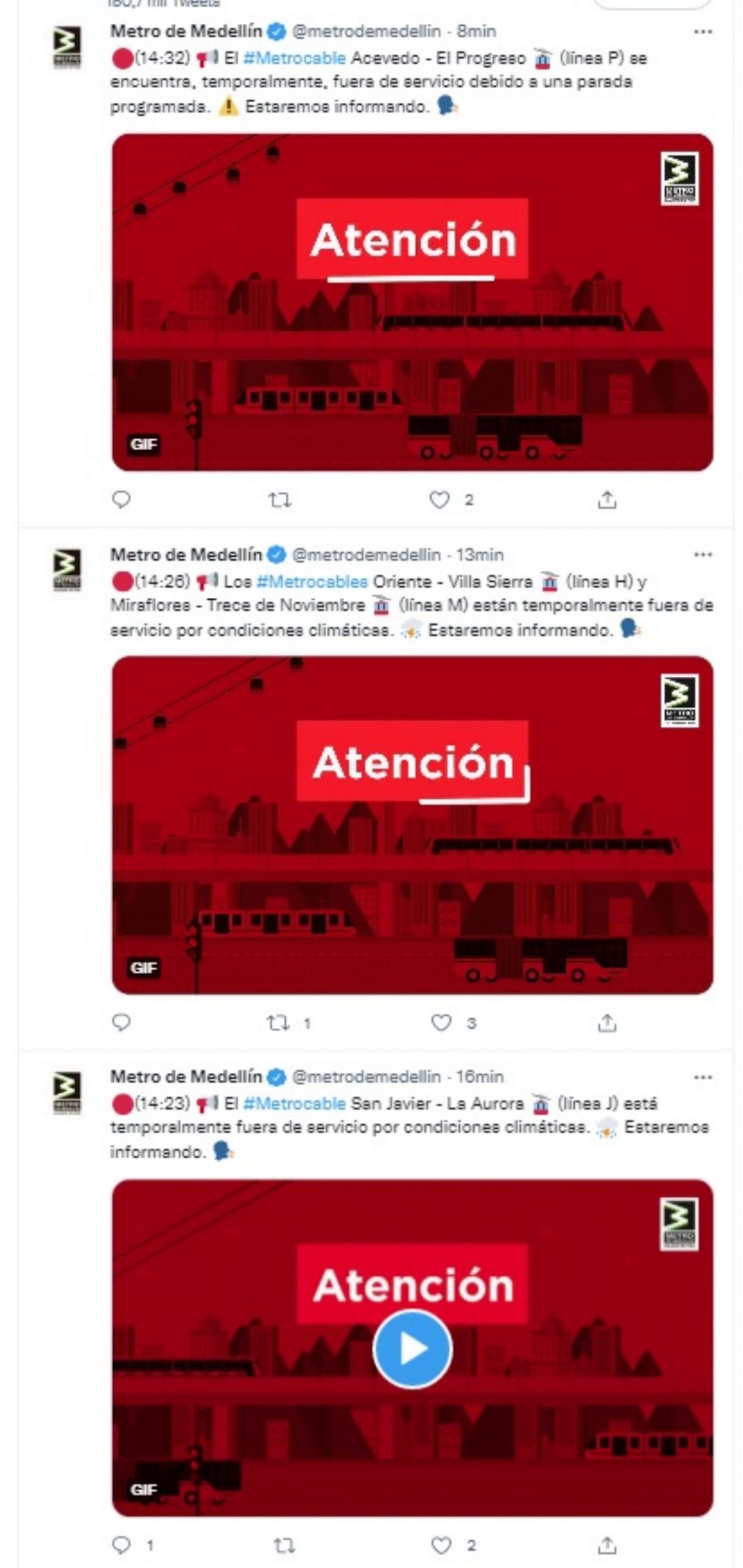 A las 2:23 de la tarde de este 29 de marzo, en la cuenta de Twitter del Metro informaron: “El Metrocable San Javier – La Aurora (línea J) está temporalmente fuera de servicio por condiciones climáticas”. Luego detallaron que Los Metrocables Oriente – Villa Sierra (línea H) y Miraflores – Trece de Noviembre (línea M).