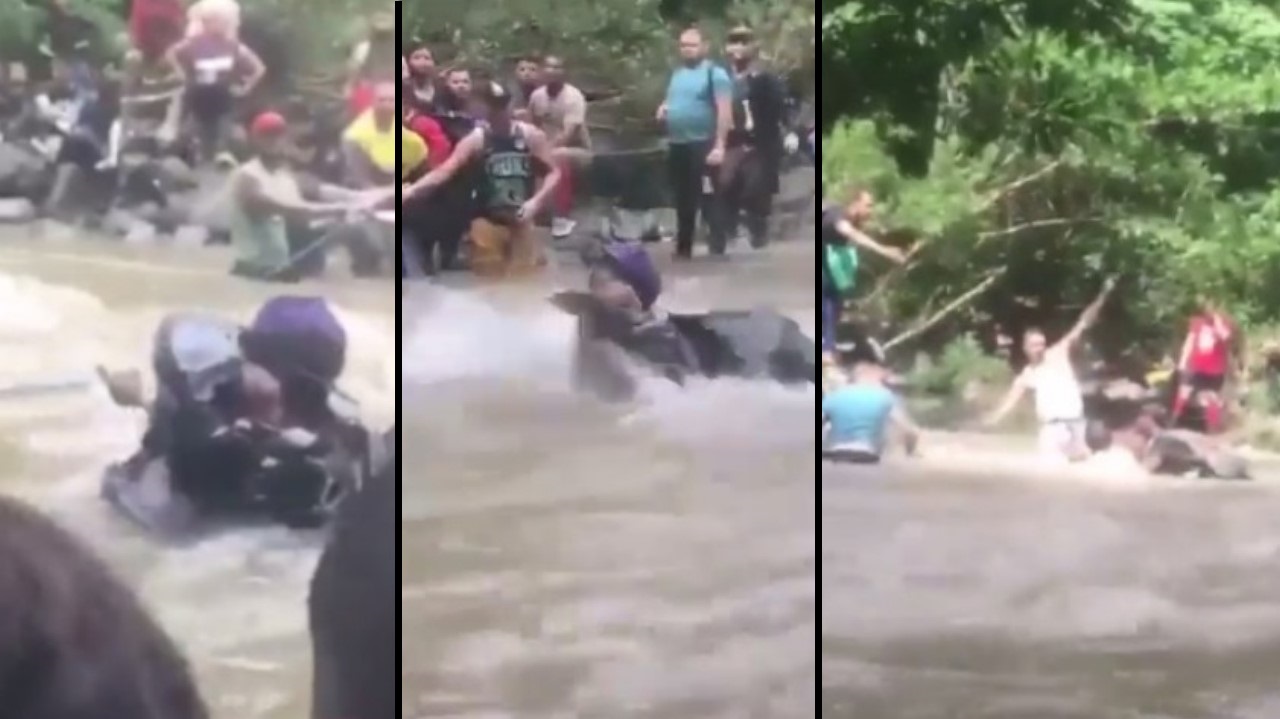 En el video se ve que el hombre casi muere ahogado junto a su bebé de brazos. Algunas personas se lanzan al río para lograr ayudarlo y sacarlos con vida.