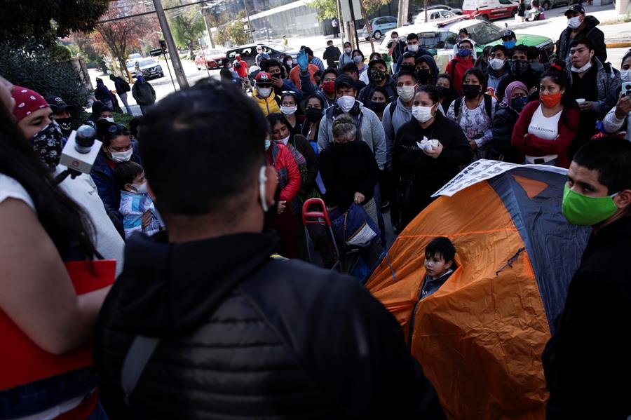 Un grupo de unos 50 ciudadanos de nacionalidad peruana acamparon por tercera noche consecutiva fuera del consulado de Perú en Santiago de Chile este jueves reclamando ayuda para regresar a su país en medio de la emergencia sanitaria del COVID-19.