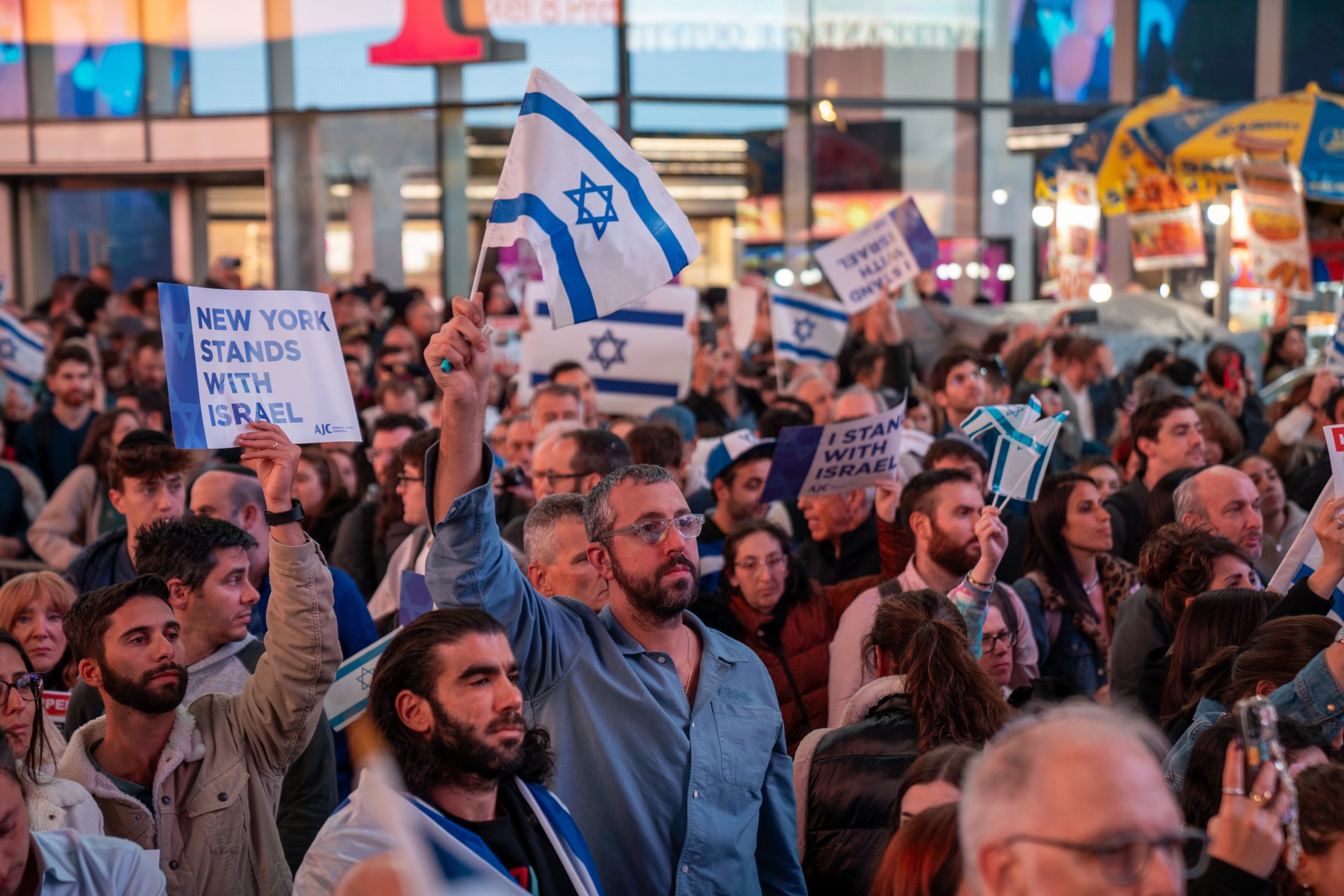 El Consejo Israelí Americano, que había convocado la concentración, contrató varias de las pantallas luminosas gigantes que rodean la icónica plaza para proyectar durante más de una hora la bandera de Israel o las fotografías de algunos de los rehenes capturados por Hamás.