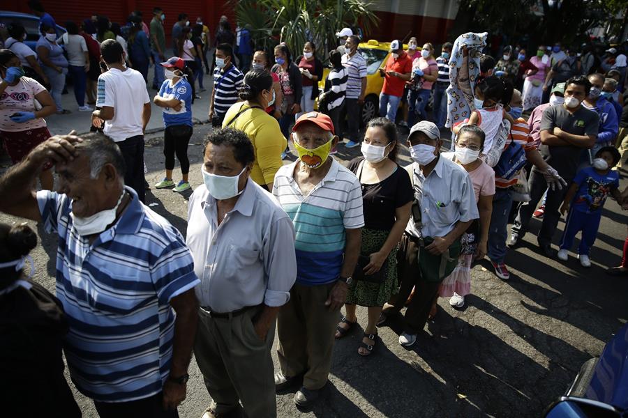 Miles de salvadoreños salieron este lunes a las calles en plena cuarentena domiciliar obligatoria por la COVID-19 en busca de un bono de 300 dólares para la alimentación anunciado por el presidente del país, Nayib Bukele, para más del 75 % de los hogares, según pudo constatar Efe.