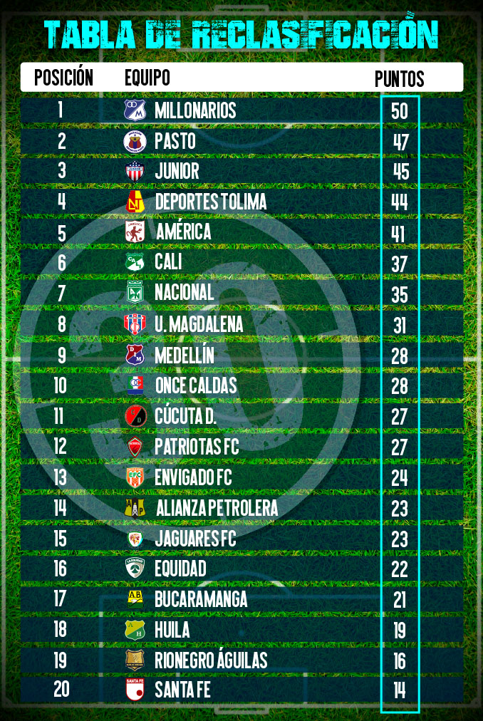 Millonarios, que se quedó con las manos vacías a pesar de la destacada campaña que realizó en el primer semestre, lidera este escalafón con 50 puntos y le apuntará a mantenerse en el primer lugar para obtener el cupo a Copa Libertadores.