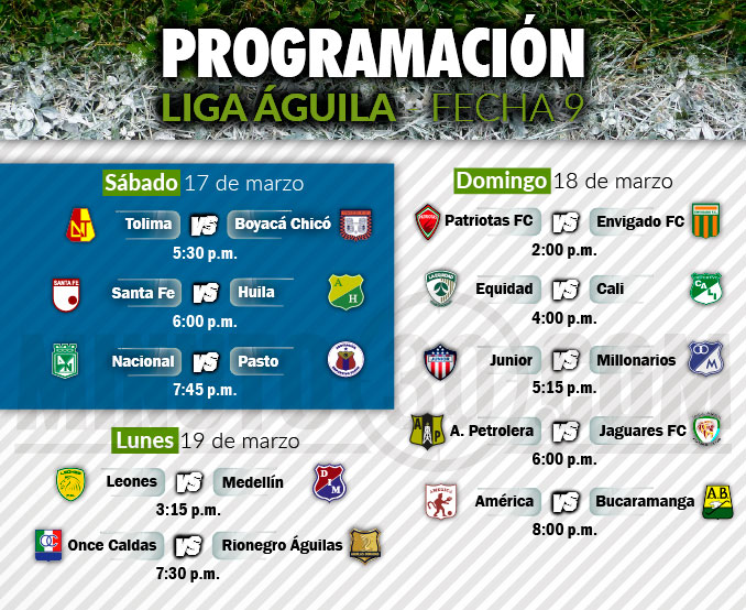 Por su parte, el Atlético Nacional, que dirige el argentino Jorge Almirón, recibirá este sábado al Deportivo Pasto sin su goleador Dayro Moreno, ausente por suspensión, y con la mira puesta en el liderato, que cede por diferencia de goles al Once Caldas.