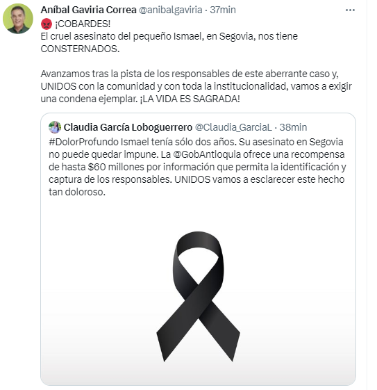 El Gobernador de Antioquia, ante este crimen manifestó, “el cruel asesinato del pequeño Ismael, en Segovia, nos tiene Consternados. Avanzamos tras la pista de los responsables de este aberrante caso y, unidos con la comunidad y con toda la institucionalidad, vamos a exigir una condena ejemplar. ¡La vida es sagrada!”.