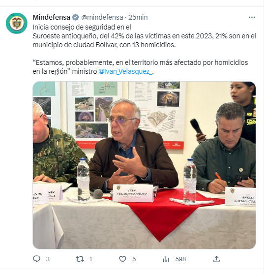 El ministro de Defensa, Iván Velásquez Gómez, acompañado de la cúpula militar y de policía estrarán en los municipios de Sonsón y Ciudad Bolívar, Antioquia, para realizar consejos de seguridad y hacer seguimiento al orden público en el sur del departamento.