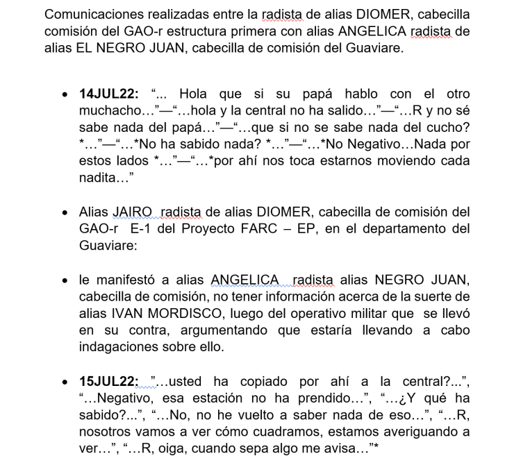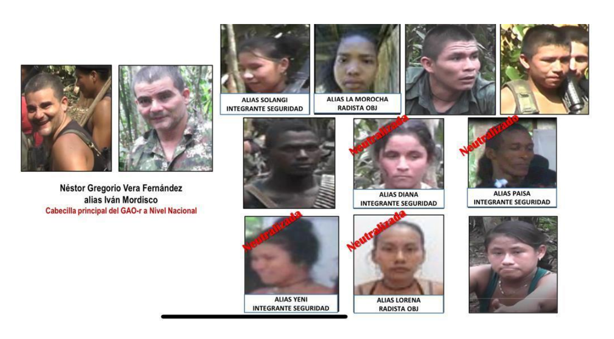 Inicialmente mostró una fotografía de cuatro personas, que serían parte del grupo que siempre se movilizaba con ‘Ivan Mordisco’ y de las cuales dijo, murieron durante el operativo. Una de ellas, fue alias ‘Lorena’, quien sería la compañera sentimental del cabecilla, su cuerpo sin vida habría sido intentado ser sacado del lugar, pero por la presión de la fuerza pública no se pudo.