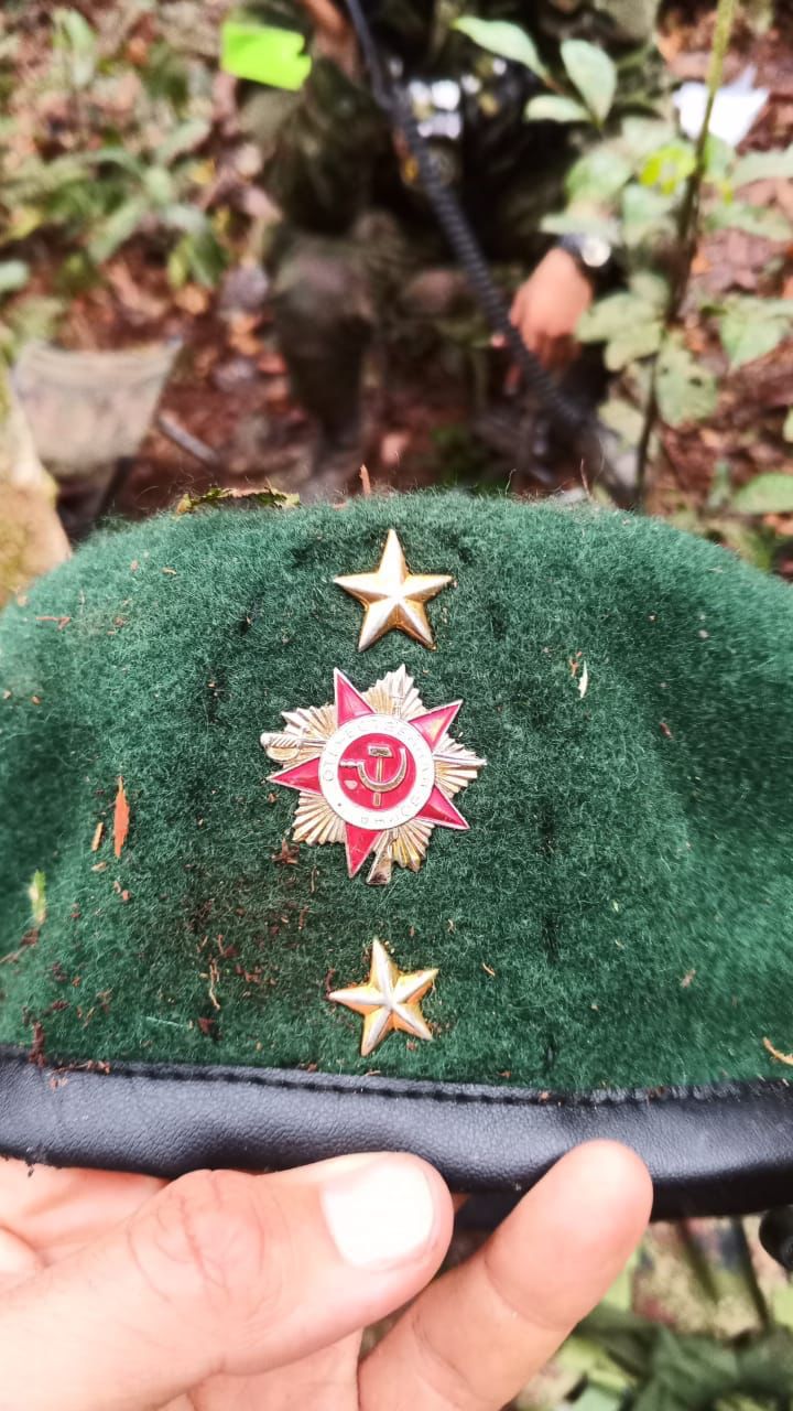 Otra de las pruebas fue la boina, “a partir del 2010, cuando fue neutralizado el ‘Mono Jojoy’; ‘Ivan Mordisco’, comenzó a utilizar boinas (negra, roja y verde). En muchísimas fotografías que están en las redes, ustedes han visto que siempre ‘Iván Mordisco’ aparecía con boina, fue encontrada y mostrada a las fuentes de Inteligencia y nos confirman que era una de las boinas que estaba utilizando”.